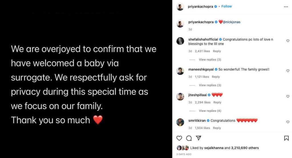 Priyanka Chopra Jonas and husband Nick Jonas on Saturday announced welcoming a baby through surrogacy